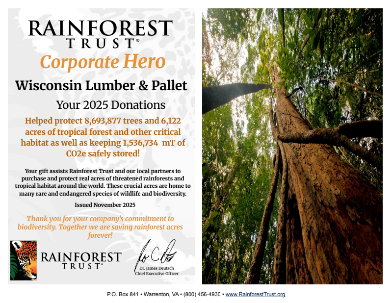 Wisconsin Lumber & Pallet is committed to giving back to the planet through our 1-2-3% Conservation Program. According to our annual Rainforest Trust reports, our combined 2024-2025 donations helped protect 8,469 acres of tropical rainforest, an estimated 10.2 Million Trees, and 2 Million mT of CO₂ equivalent stored!